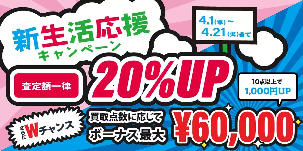 | キャンペーン | 4/21まで 査定金額 一律20%UP! + ボーナス最大6万円! | ― | ― |